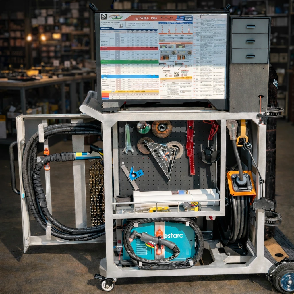 A premium mobile laser welding workstation designed for real workflow—stable mobility, organized routing, and clean storage that holds up to daily use.